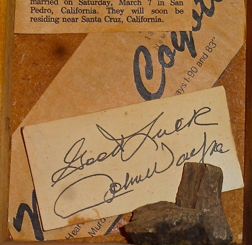 Long story short, John Wayne did not come back to campus with us. His manager managed to persuade him it was not in his best interests given that something in California was important enough to warrant his immediate return. But, I did get his signature and no, I did not turn it in for Sigma Chi Derby Days. To this day, it resides in a square of a memory box—one of the kind popular in the sixties and seventies that is made out of an old newspaper print box—and as proof, I include a picture below.