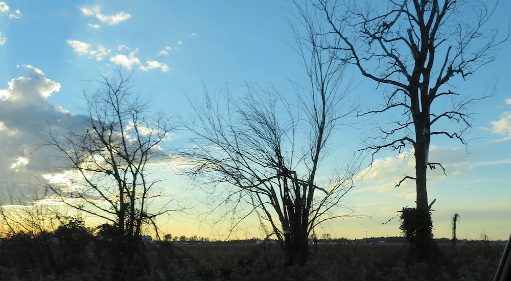 As it rose higher in the sky it grew larger but stayed indistinct—like a large fuzzy, uneven-sided bright oval  larger than the sun and somewhat fuzzied and diluted by clouds. It had an otherworldly effect and as the stars came out above it, it seemed in stark contrast to the clear silhouettes of the palm trees further to the West. Did the moon ever rise at 5 a.m.? Surely not. The moon rose at night and set in the morning as the sun rose.  Could this be the sun rising at 5 a.m.?  If so, there were no colors of sunrise flooding the sky around it.