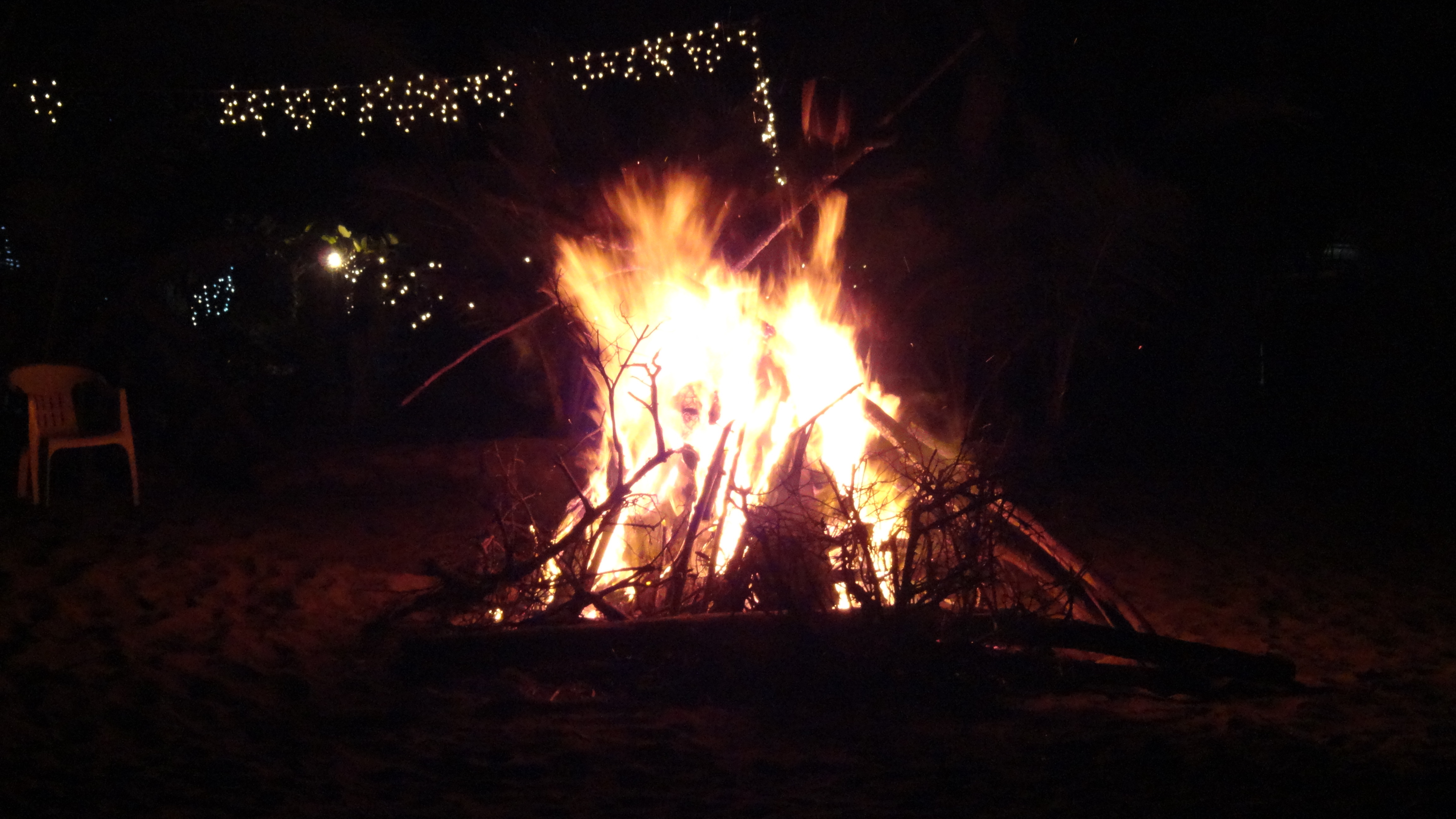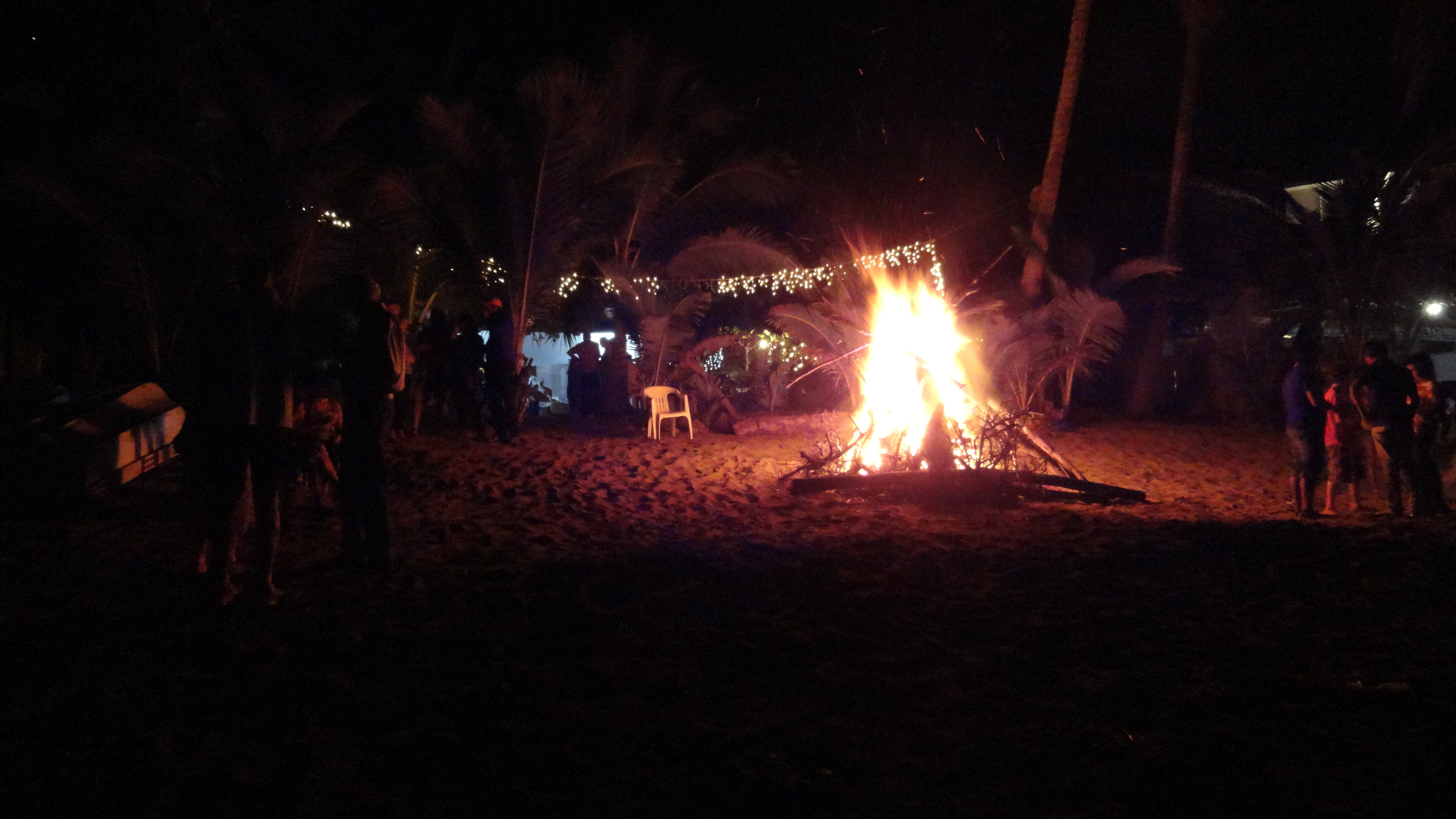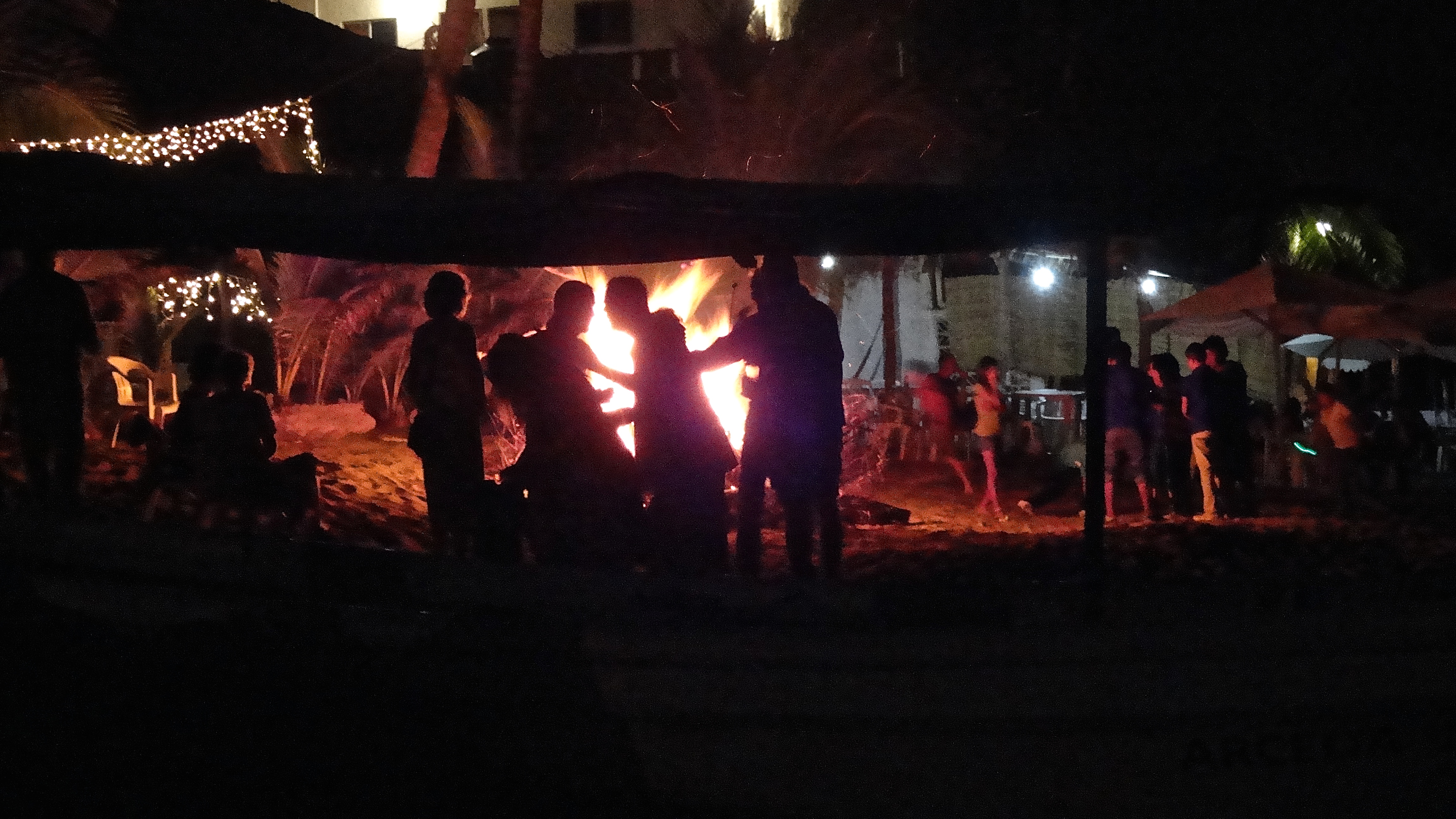 We walked up the beach a mile or two, spying on groups gathered to drink and talk in the New Year. Every group had a bonfire. Almost every group was setting off fireworks and/or globos. It was an acceptable sort of peeping-Tom adventure as I attempted to snap pictures in the darkness.