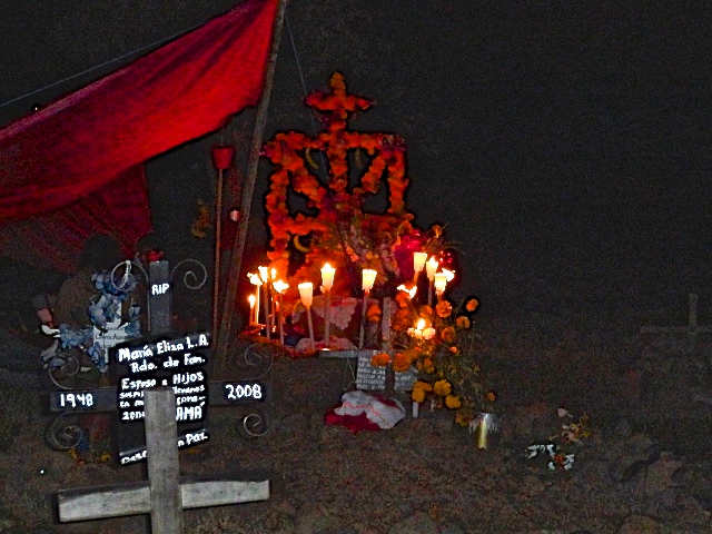 This week’s photo theme for WordPress was “Nighttime,” but it was too hard to pick one of the many night scenes I was considering, so instead I chose a series of shots from last year’s Dia de los Muertos in Patzcuaro. Dancing, graveside ceremonies, refreshments and general revelry go on all night long. Our boat broke down half way to the island and so we had an especially long night of it as men opened the bottom of the boat to try to free the fishing nets that had been securely wound around the propellers.