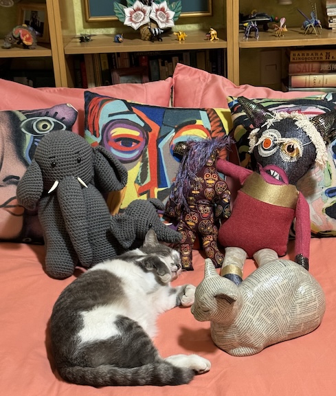 I’m lying flat on my back in bed with my computer on my stomach between us, so couldn’t see this little girl but could feel her using the space between my legs as a cradle. So comfy!!!! I held the phone up in the air over the open computer to catch this shot. She looks pretty comfy. No fear she’ll roll over in her sleep by mistake with my legs as a snug frame.