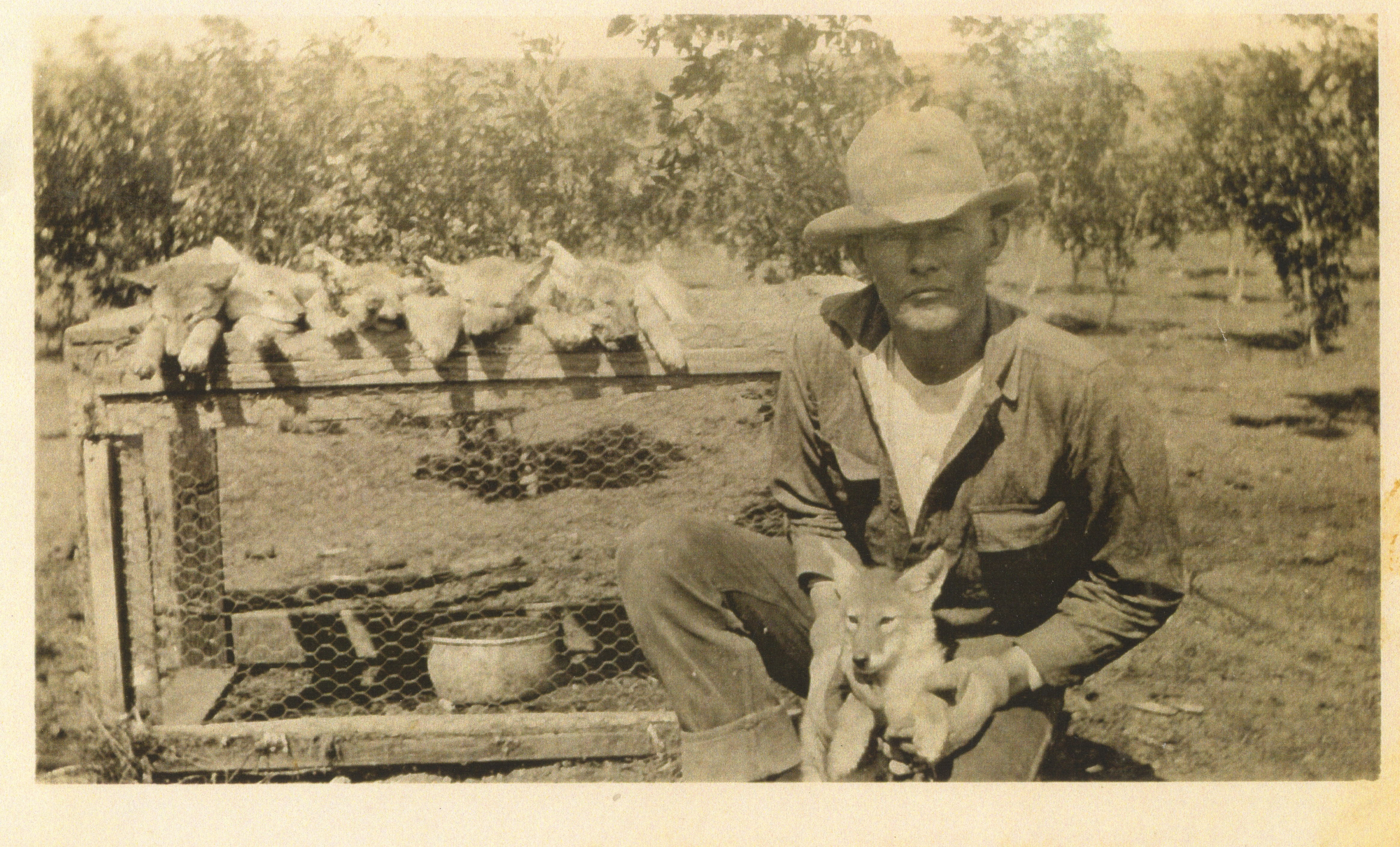 Dad with sleepy coyote pups on South Dakota farm, 1924