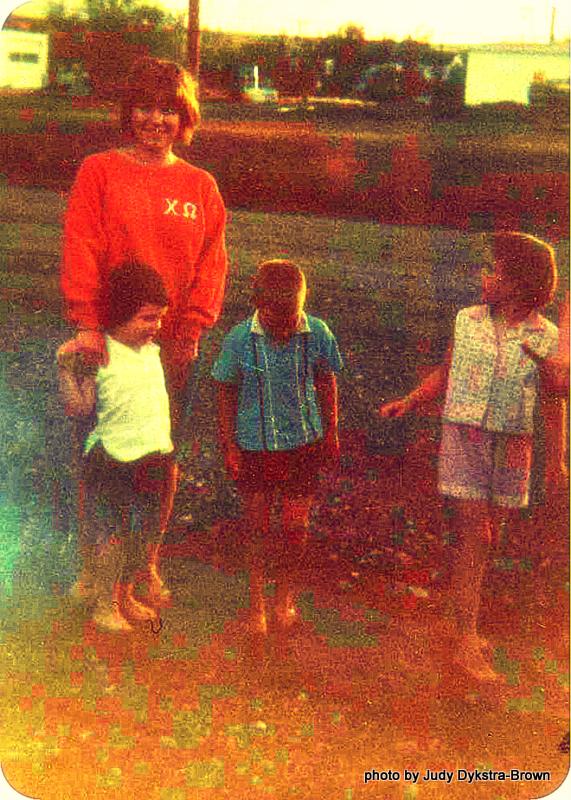 Writer’s note: I know my sister Patti is going to read this and cry, and so I want to present you with this mental picture of her, college age, Levi cuffs rolled up above her knees, surrounded by five-year-old neighbor kids, enjoying her last big adventure out into the ditches of Murdo, South Dakota, during a July rain.