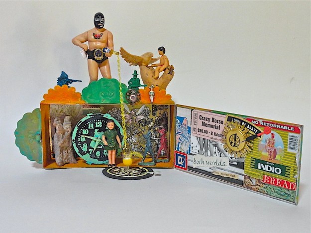 This piece is about old and new, peace and conflict, blended cultures, freedom and confinement, the wide variety of what the world has to offer and the need to stay on target, to have fun and to spend our time wisely. The Luchador is wearing my All State Choir pin as a belt buckle? What’s that about??? I’ve recently added this piece to the show, along with several other new pieces, as work has sold.