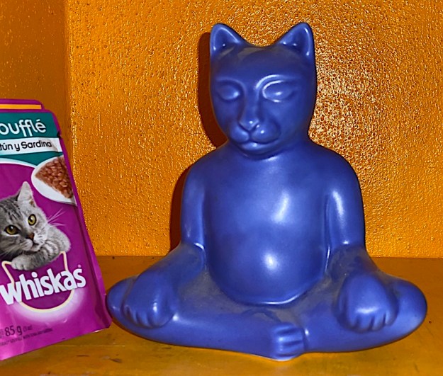 When my friends John and Cleo and their housemate Jay all passed away within a year of each other, John’s son asked me to choose something from their house to remember them by. This little Egyptian blue Buddhacat was what I chose. He sits guarding my catfood in my kitty bodega.