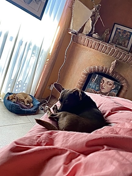 At night, in bed, I am a highway for dogs jumping into bed to snuggle down for the night and likewise for the same dogs springing from the bed to investigate the slightest noise in the backyard or the street. One bound, using me as trampoline, propels them to the floor, and one more, in a flash, shoots them out the door. Any stray possum or other late night intruder into their domain not driven off by their initial loud growls and following barks is dealt with in a snap of the jaw. No furtive ingress into my nighttime garden goes unnoticed. Then, the intruders dealt with, back into bed they bound, usually landing on one arm or the other, leaving yet another mark of their affection. They are my protective angels, these small warriors of the night, but I fear they are loving me to pieces, as one glimpse of my arms will attest to.
