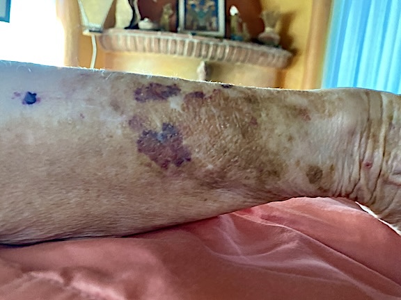 When I look in the mirror, I sometimes feel like I’m becoming my mother, but when I look at my arms, it is also revealed that I am becoming my grandmother. By the time she passed away at age 96, any effort to assist her in rising or sitting up by grasping her lower arms could result in the skin actually tearing off in pieces like tissue paper, and although not quite at this stage, At 76, I have grown fragile. My skin has become translucent, showing off deep blue or purple bruises from below given birth to by slight bumps or scrapings against even smooth surfaces—the edge of a table or a door. Small beads of blood flow out from tears of skin caught in a cat’s claw or a dog’s questing paw, and the skin of my lower arms is dappled with these signs of affection left by even the most furtive advances of the smallest of my dogs.