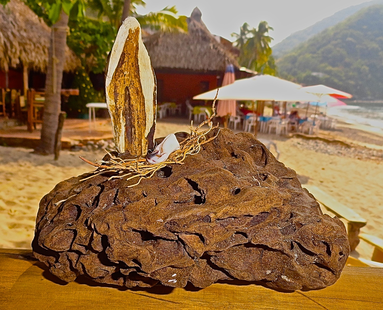 This is one of 15 creches I’ve constructed of unaltered natural items I’ve found on the beach. For some reason, I am captivated by the gentle side of Mexico best symbolized by her obsession with the Virgin of Guadalupe. I’ve seen motorcycle leathers with an image of Guadalupe on the back! I’ll publish pictures of the others soon. I know. A seeming contradiction to the words I’ve posted below, but perhaps one or the other view is just a sweet little lie!