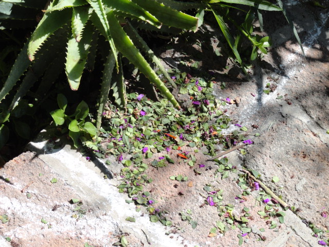 DSC09398(Above:) Here you see bougainvillea, honeysuckle and hibiscus fallen to the tiny but effective jaws of the leaf cutters. This pile of leaf segments cut from the bushes above awaits transport to the nest.