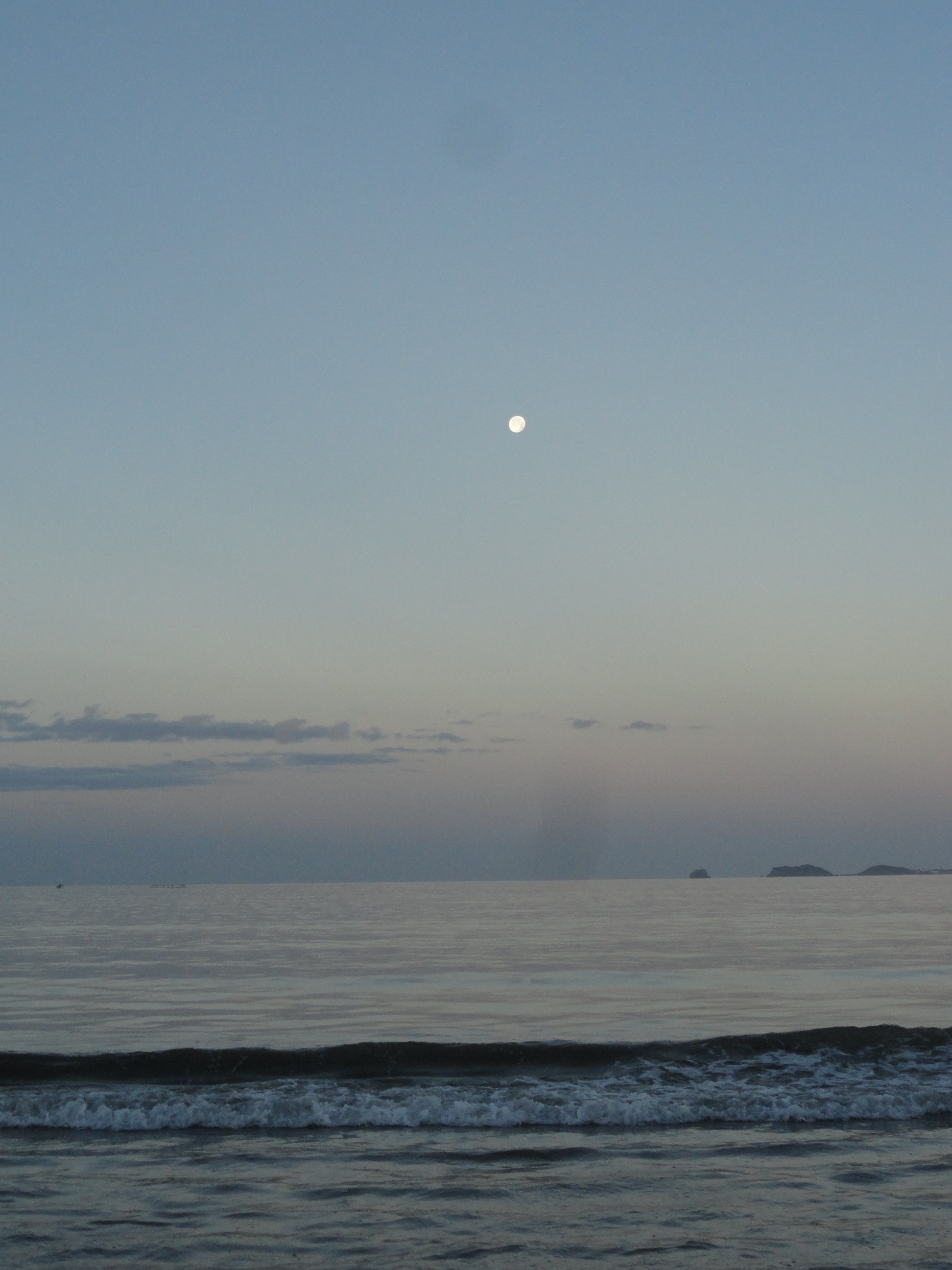 When I am at the beach, the first light of day for me is always the moon, which is still up at 6 when I begin my beach walk.  If I’m lucky, I’ll make it the 5 miles to Boca de Iguana and back before the sun is fully up.  Much as I love sunlight, my particular pigment demands that I enjoy it from the shade.