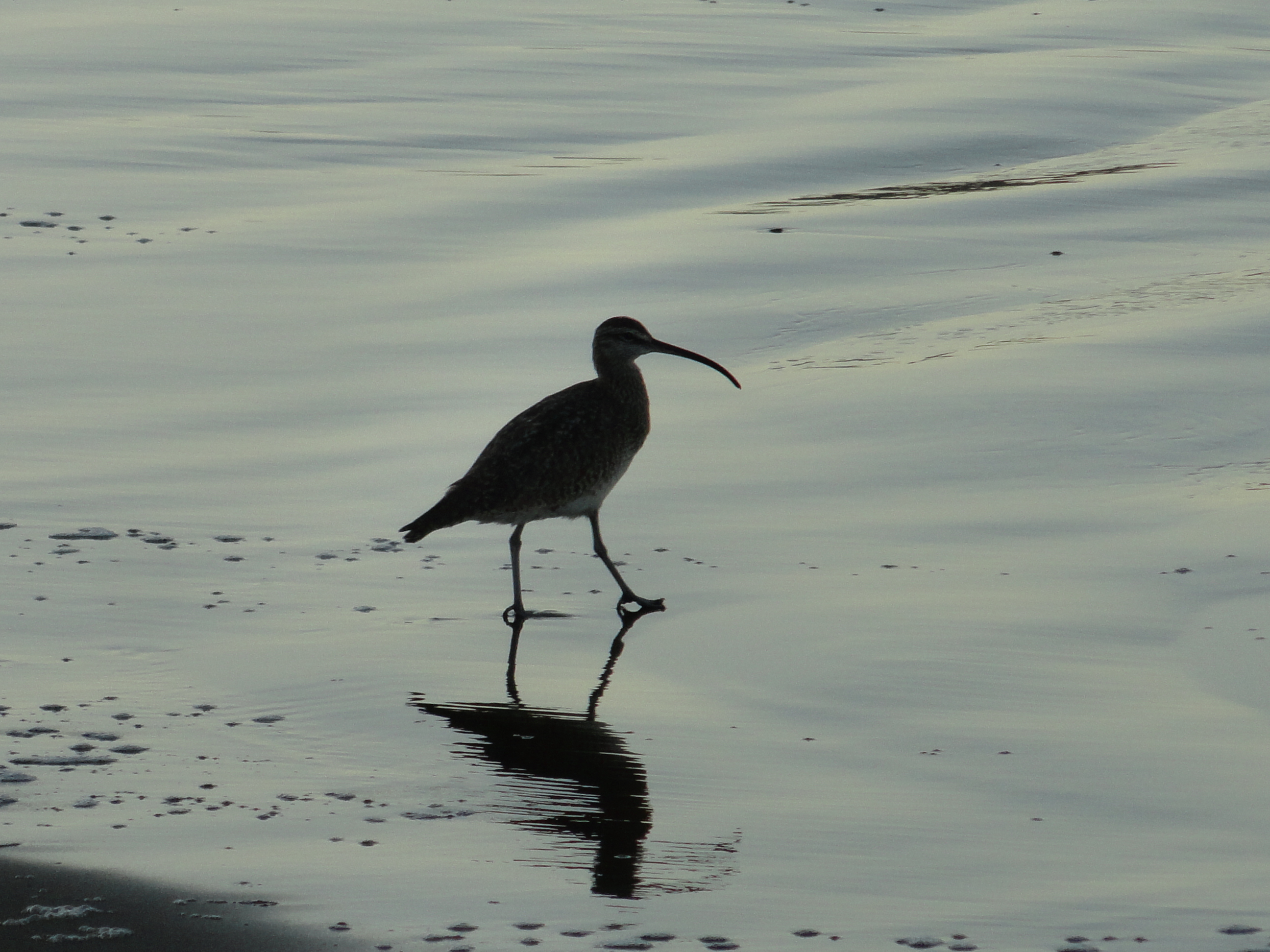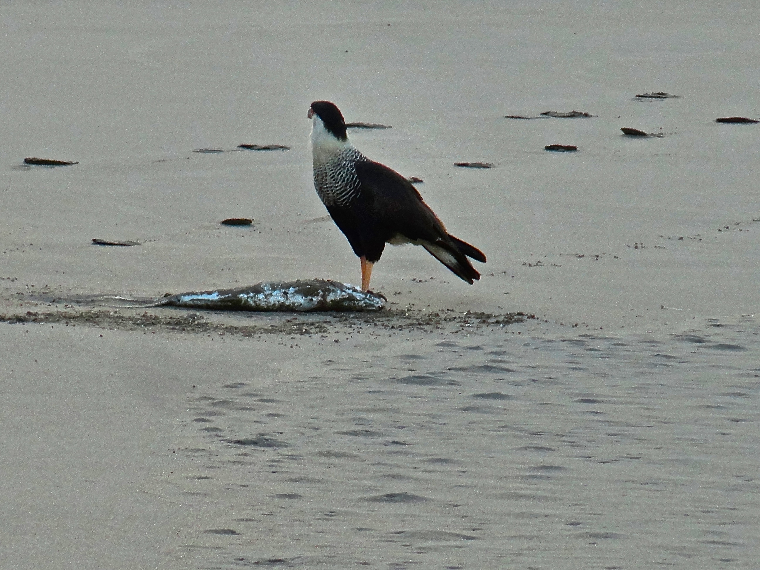 As the sun comes up but does not yet peek over the mountains and palm trees, the birds and I comb the beach. I find an already-drying starfish.  The Caracara bird finds a fish, the sandpipers and gulls various delicacies barely buried in the sand.  Before me, I see only two earlier human birds than I, their evidence left by their footprints.