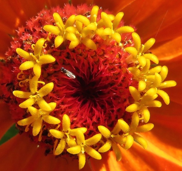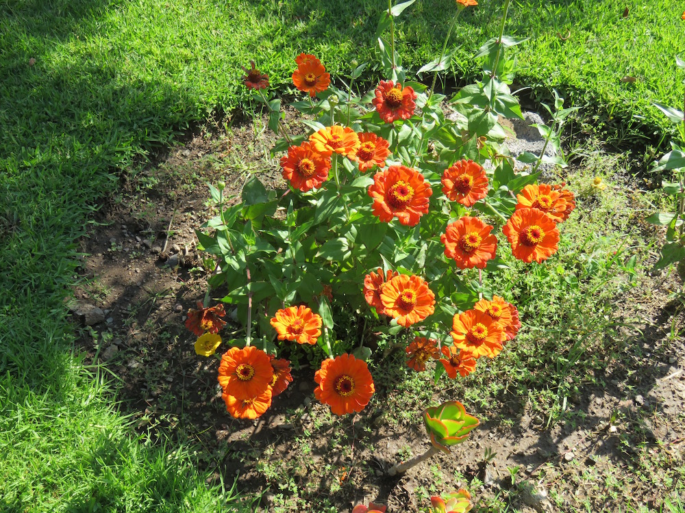 Not many zinnias this year. This little fellow was a volunteer, peeping out from underneath the stone at the base of a palm tree.