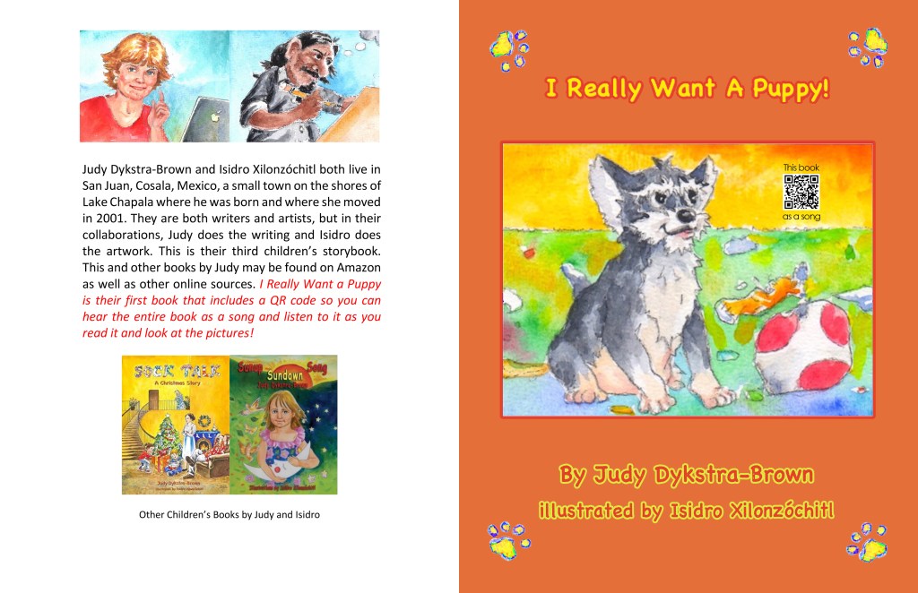 What’s a boy to do when all his friends have puppies but he doesn’t? This book’s hero finds a novel way to get around his mom’s reluctance to adopt a dog. This is the third rhymed picture book written by Judy Dykstra-Brown and beautifully illustrated by Isidro Xilonzóchitl, but this one not only tells and shows you the story, it also sings the words of the book to the reader by means of a QR code on the front cover! Drum beats indicate to nonreaders when it’s time to turn the page to see the next illustration. Younger kids love to “learn to read” by singing along with the words to the song while following the words in the book. Older kids just love the story and illustrations.