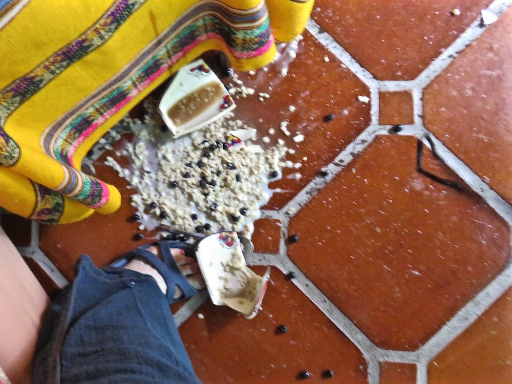 I mourned the cup for thirty seconds or so, then mourned the time I was about to lose cleaning up this big mess. The oatmeal and milk and berries had scattered over quite a big area of the floor and it was a sticky, globby mess.