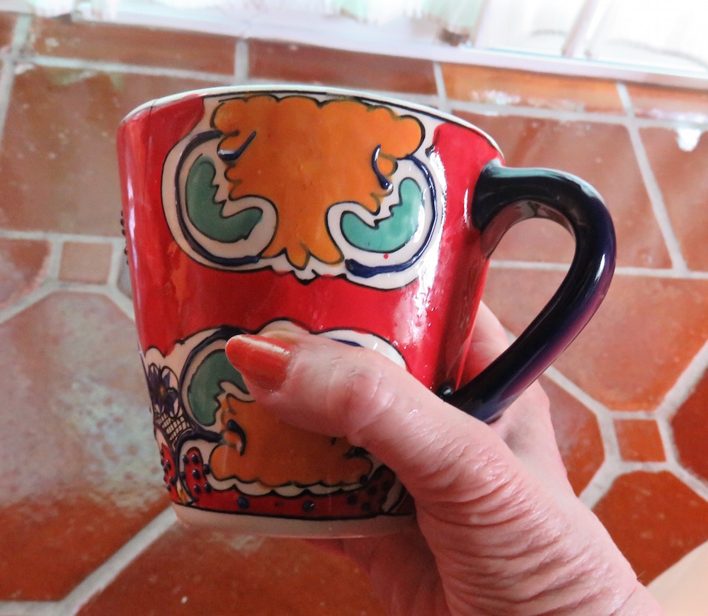A few weeks ago, I bought this wonderful large talavera cup. It tapers out from the bottom, holds about 2 cups of coffee or soup or cereal, has a handle and is beautiful to boot. I just love it. Whenever it isn’t in the dishwasher, I use it for every meal or every time I have coffee.