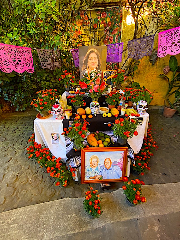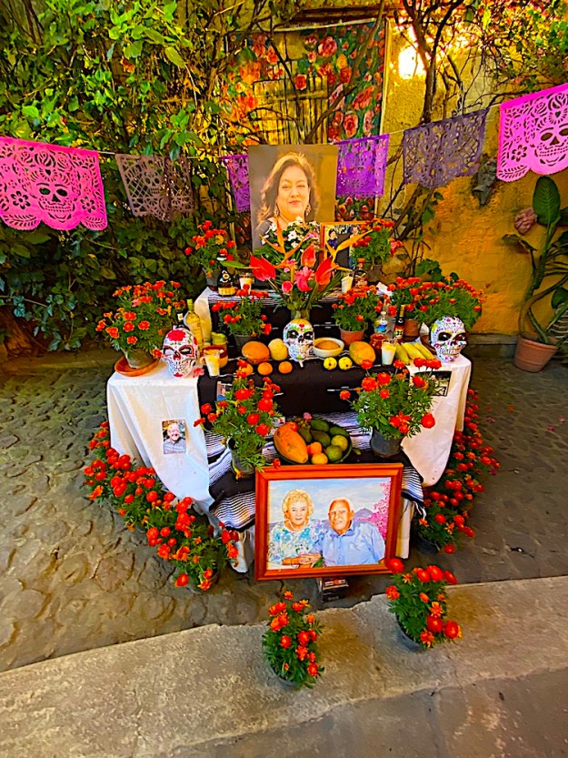 This is this year’s minimalist altar for my departed: husband Bob, Mother Pat and Father Ben. I wasn’t going to do one. Then Yolanda (my housekeeper) told me about a friend who didn’t make a Dia de los Muertos altar for her mother who had recently died. This friend then went to see the elaborate offerings of her brothers and sisters, so she brought a rather poor specimen of a pumpkin and told them they could put that on her mother’s grave. That night she had a dream of walking through the graveyard. Every other grave was elaborately decorated with flowers and sweetly-scented candles and favorite foods of the departed: water, whiskey, tequila. When she got to her mother’s grave, there was no light and there were no offerings—only the one poor pumpkin. As she walked by, people shook their heads, and she left in shame. When she woke up, she went to her mother’s grave and took her fresh water, a candle, sweets, and all of the things her mother loved.
