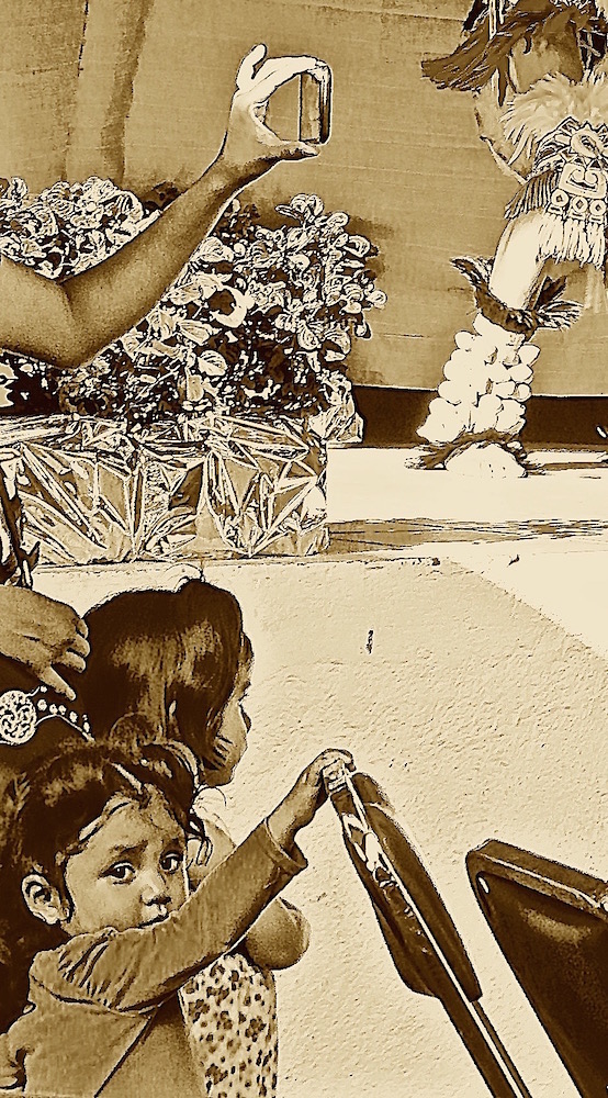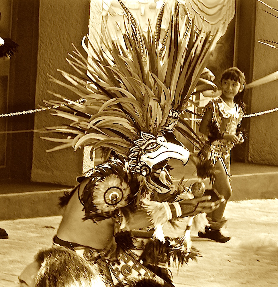 I went to the DiF center in Chapala for a ribbon cutting for a new mural by my friend Jesus Lopez Vega this week.  (He did the murals around my house doors, on my garage door and nicho, the detail work around all my arches in my house and many of the paintings you’ve seen inside my house.)  During the two and a half hours of speeches, folklorico and indigenous dances, I got caught up in the interaction and contrasts between the dancers and the characters in the murals, which depicted the different social services that the DIF center offers: education, medical care, food for the aged and needy and support of indigenous cultures.  My settings weren’t right to catch good detail with all the movement, so I started cropping and playing with light, detail, filters and saturation and found that often, in spite of losing the brilliant and varied colors, that switching to sepia brought out the narrative in the pictures.  Here are some of my “finds.”