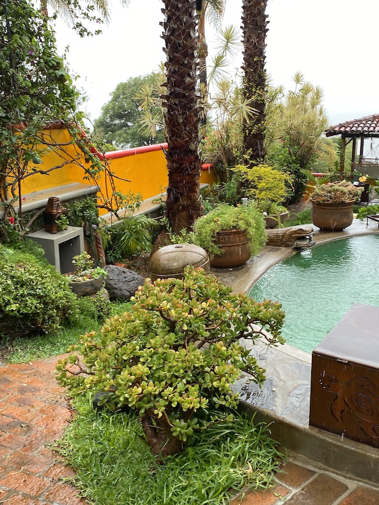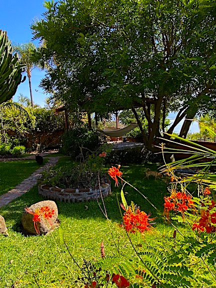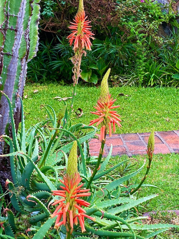 The garden isn’t at its best during the dry season, but I’ve had a request to photograph it, so here it is, with all of its warts. With the exception of the sculpture of the seated woman from the front patio, this is all the back garden. The front garden is a bit of a mess due to all of the debris from the roof repairs. I’ll show it in a later post. The dome of the roof is here pictured as a pale gray as it is currently being repaired but will eventually be restored to its rose color. Please click on first photo to enlarge all and view as a slide series.