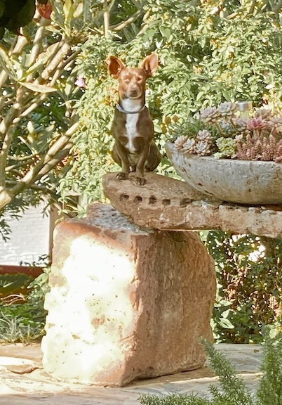 So, Coco, in disgrace, was banned from the house while I cleared away some of the damage. Tomorrow I’ll replace the papel picado and Yolanda will sweep up shards I overlooked in the darkness of the hall. Coco is once more installed in my bed—a necessity when she was going crazy over the opossum negotiating the high wall of the backyard into the front yard for her nightly feeding. There she promptly got into a hissing exchange with the cats, who I brought in to preserve the peace. The opossum has long since finished her dinner and the cats have again been relegated to the outside lest they, too, decide to visit the altar.