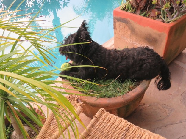 “Go get the ball, Morrie,” I command, and he runs with less speed and vigor down the hill to the garden. I hear him checking out his favorite places, but he does not return, and when I call him, finally, he returns, ball-less, jumps up on his mound and falls asleep.