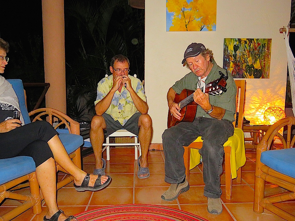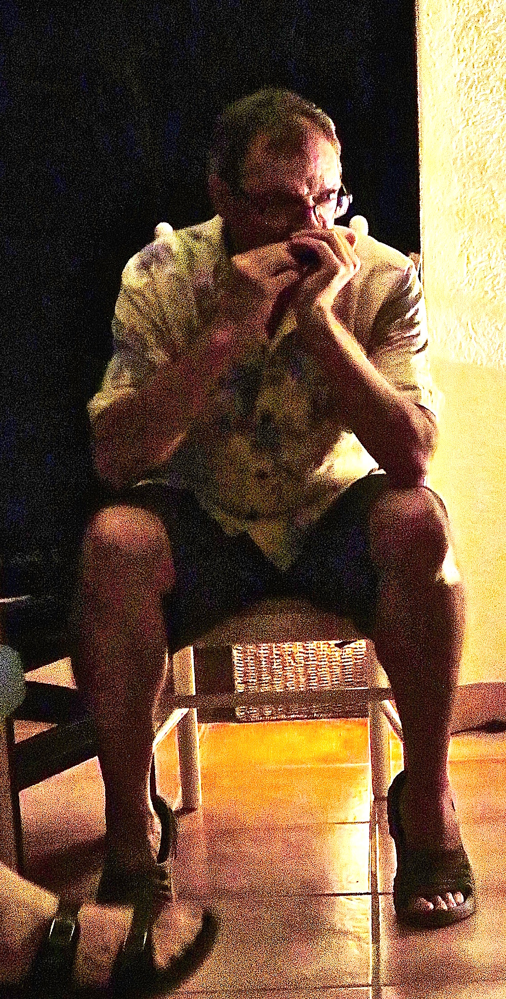 Guitar, harmonica and flute. Not a bad combination. We mouthed the words we weren’t sure about but came on strong during the choruses!!