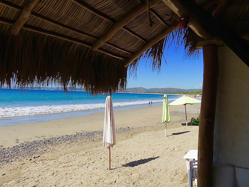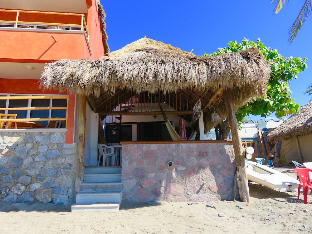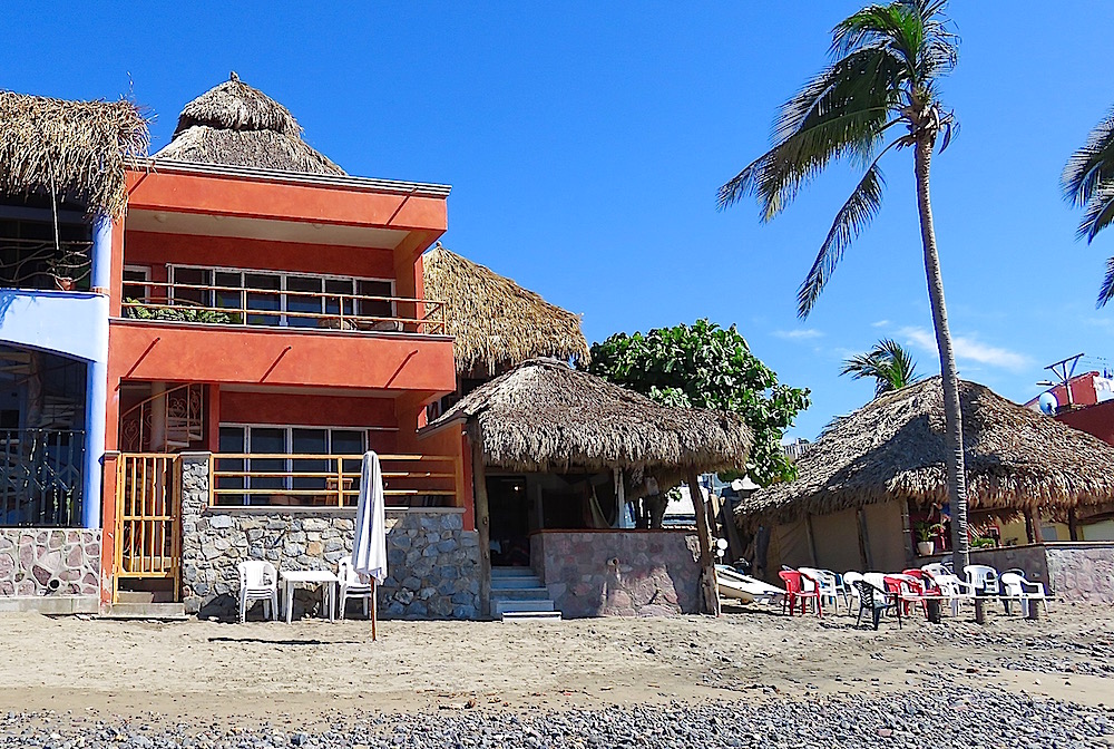 The porch was rebuilt on Casa Gaviotas, but instead of bamboo and wood, it is now concrete and stone. The palapa roof seems to have survived the hurricane. The little palapa structure to the right of the orange building is Casa Gaviotas–my home away from home.