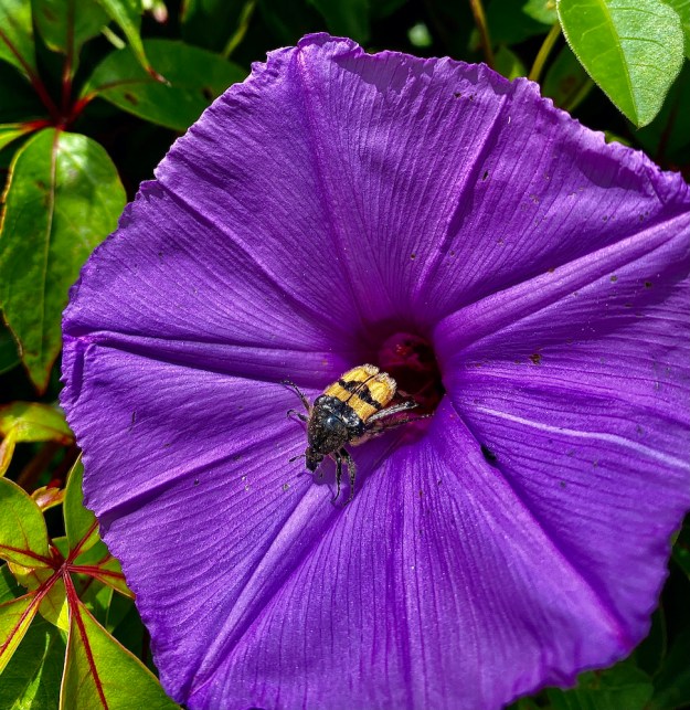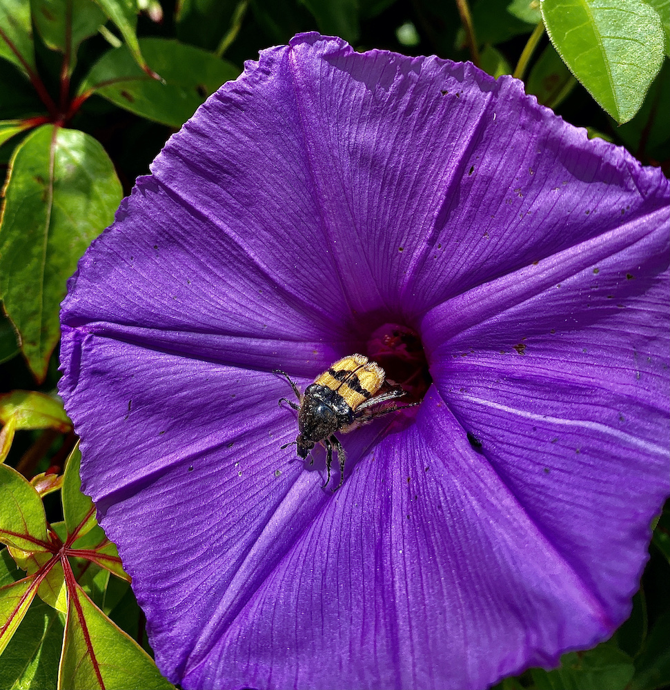 It isn’t very far from my studio in the garden to my bedroom door—just about 6 feet of sidewalk, then a twelve foot steep ramp that used to be just the wall beside the stairs down to the basement kiosk that I had added a hand railing to and maybe 8 feet across the patio, but laden with a lamp I’d just repaired, my computer, phone, two tubes of glue, an empty cup and my hank of keys, it was a bit of a balancing act. It was nearly 1 a.m. and pitch black outside and I had the studio to lock up and then the house to unlock. But when I saw the loaded hibiscus bush in full bloom at night, probably due to the motion-detector light that the dogs had been setting off all night-, I knew I had to take a photo. So, everything in my arms went down on the sidewalk while I searched for my phone, with no success! So, about face, open the door and the search for the phone began. I finally had a flash of memory of putting the phone on the grinder when I had used the bathroom earlier. On my way out of the studio for the second time, however, I noticed Diego tracking something along the ground and noticed a beautiful small beetle. Then, two more on the screen. So, if I hadn’t decided to photograph the hibiscus and if I hadn’t left my phone in the studio, I never would have noticed these two varieties of beetle that I’ve never seen before. Finding the treasures in adversity. One of the great learnings of life. Here is what I saw on my short way home from the studio tonight: