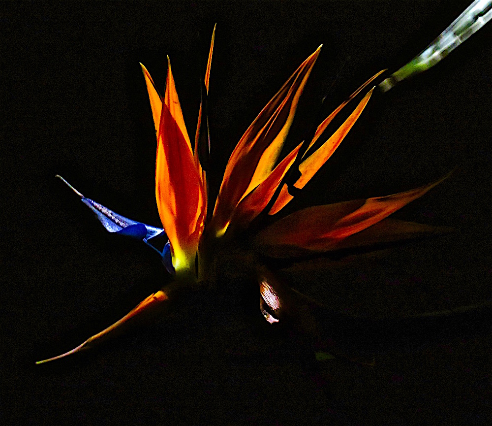 I saw this bird in the light from the wall lamp outside the guest room as I opened the front gate at 9:30 PM to let guests out after a film night at my house tonight. I remarked on the interesting lighting and my friend Glenda remarked it was more interesting because of the street light shining on it as well. I wedged the gate open with an old axe head of my grandfather’s, went in to get my camera, got distracted and promptly forgot about it. It was after 1 a.m. when I decided to post a photo of a flower for my 3400th posting, remembered seeing a flower I wanted to photograph, remembered I was with Glenda when I saw it and started combing my memory. I then remembered it was a bird of paradise and went out to find the gate still wedged wide open. Not a good idea in Mexico–especially with an axe head invitingly wedging it open!!! Sheesh.