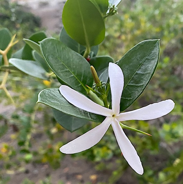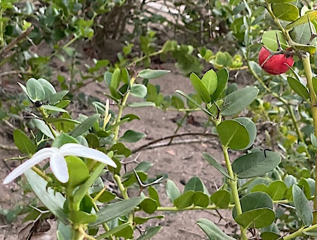I saw this small tree at a local outside restaurant and had to look it up. It is a balloon plant, asclepias physocarpa. It is a relative of milkweed, which explains the monarch butterflies we saw floating over the pool in front of these trees. Yves, the owner of the restaurant, who always likes to stop and sit and chat a bit, called in the man who stands in front of the restaurant, offering to wash cars, and he picked two of the pods off the trees, saying we could dry them and plant the seeds and also gave me two small trees in coffee cans, which I of course paid him for. When I got home, I looked the plant up, thinking it might be a relative of Chinese lanterns, which are orange, but in a similar inflated shape. I can’t find any evidence that they are but did find out the sticky white sap they exude is mildly poisonous. It reminds me of the caustic sap of crown of thorns, so I was not surprised to hear this. Now I have to decide where to plant it. Perhaps outside the window in front of my desk so I can see if it does attract monarchs.