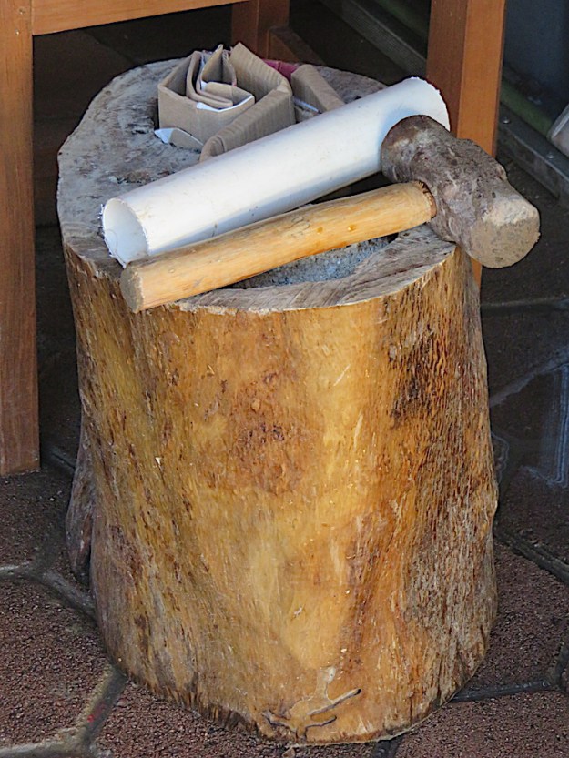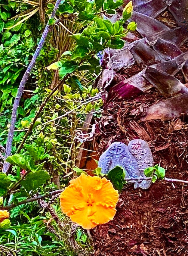 My husband Bob carved this plaque that I’ve hung on the palm tree where I pass it every time I go down to the garden. The quote on it, “And Owl moved to some other tree,” is from Winnie the Pooh, I believe. It looks like flowers just want to grow nearer to join it!