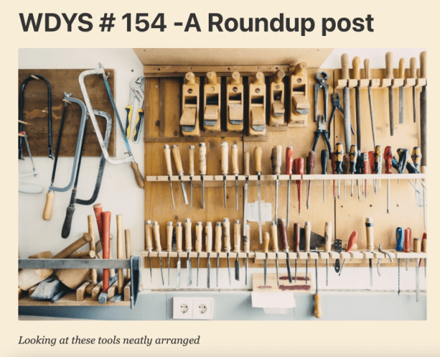 I can’t see tools without thinking of my husband Bob who had every tool on earth. Here is a poem I wrote about him. It’s been on my blog before so hope this is acceptable. Click on this link to read the poem:  https://judydykstrabrown.com/2016/11/27/you-have-become-the-art-you-lived-for/