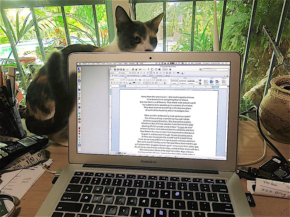 The rainstorm hit just as I drove up to the house. Running from the garage to the kitchen door, a distance of no more than 30 feet, I was as drenched as I would have been if I had jumped into the pool. I created a river as I ran across the kitchen, dining room and living room, shedding clothes the entire way.  Once dried off (except for my hair) and in my nightgown, I wasn’t about to carry the cats’ food bowls out to the garage, and how could I expect the cats to eat their dinner in the driving rain? So they dined in the kitchen and quickly afterwards, chose their beds for the night. Kukla on the back of the living room sofa and Ollie on my freshly laundered, ironed and folded sheet.  I think they are in for the night.  Earlier, I had foolishly kept the kitchen door open, thinking they might wander outside once the rain ended. Instead, I entered the kitchhen a few hours later to find it filled with large red flying termites!  I quickly turned off the light and many of them swarmed to the hall, where I had left a floor lamp on.  For some reason, they were all on the floor, where I quickly stamped them to death. I hate to kill any creature, but these same termites used to invade our house in the Redwoods in California, chew off their wings and burrow their ways into the redwood walls of the house. It was them or my wooden African carvings and cupboards and furniture!