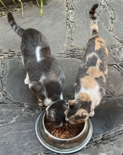 It was weeks later and they were again eating lunch on the deck when Kissy Cat came up the steps. “Miaouw, miaouw,miaoooouw,” crooned the cat, in a loud and insistent voice.