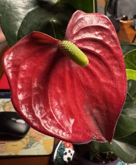 This is one of the flowers in a gorgeous anthurium plant brought to me by my friend Bruce.