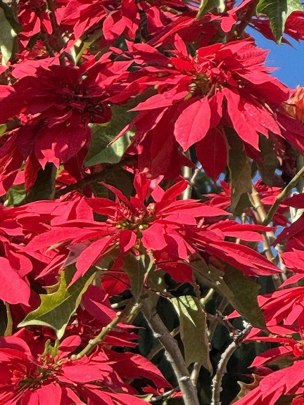 As you can see by enlarging the photos avove, the poinsettias in the planter next to my bedroom have increased in size and hue since I first showed them a week or so ago. They are never going to turn red but will get more of a peach coloration in the next few weeks.