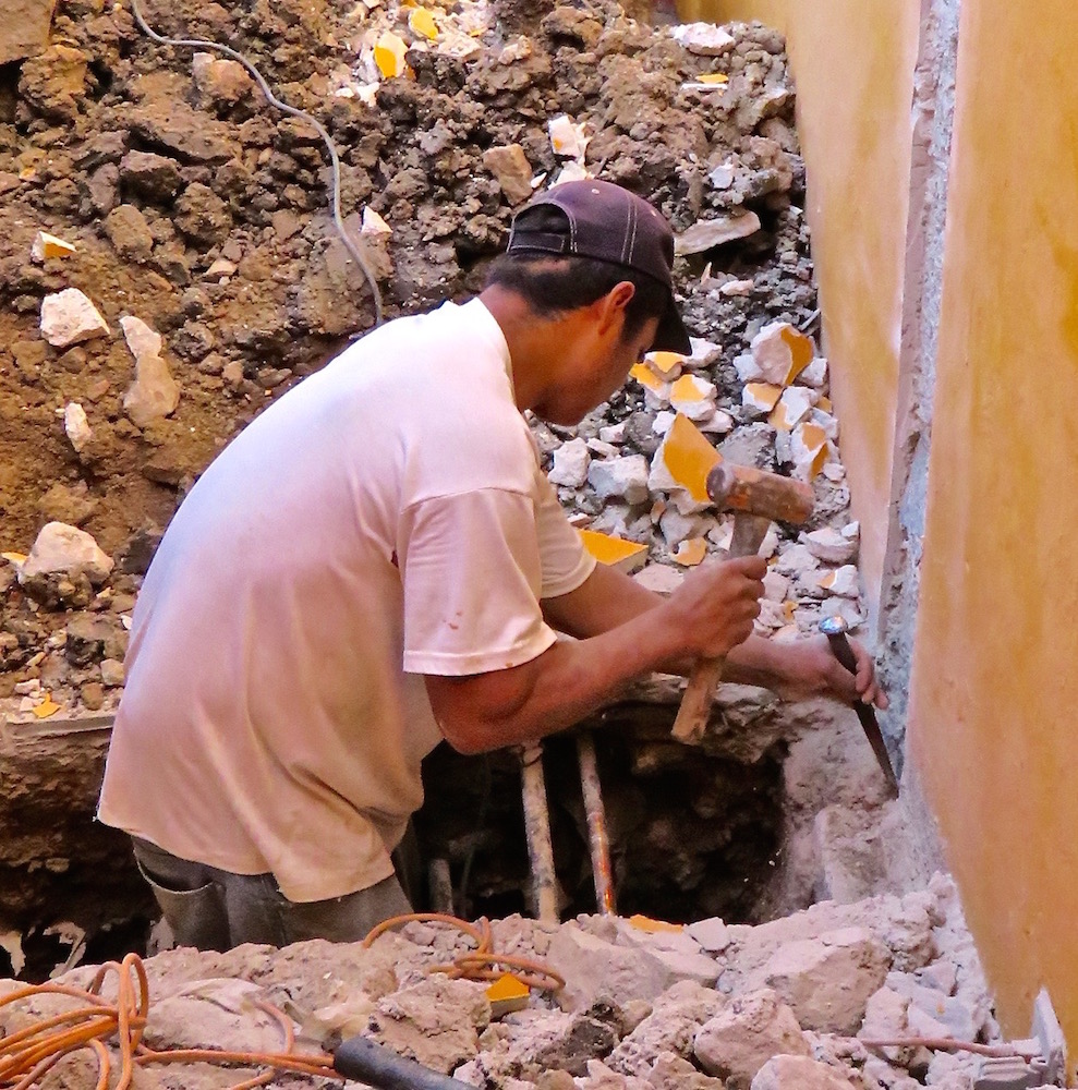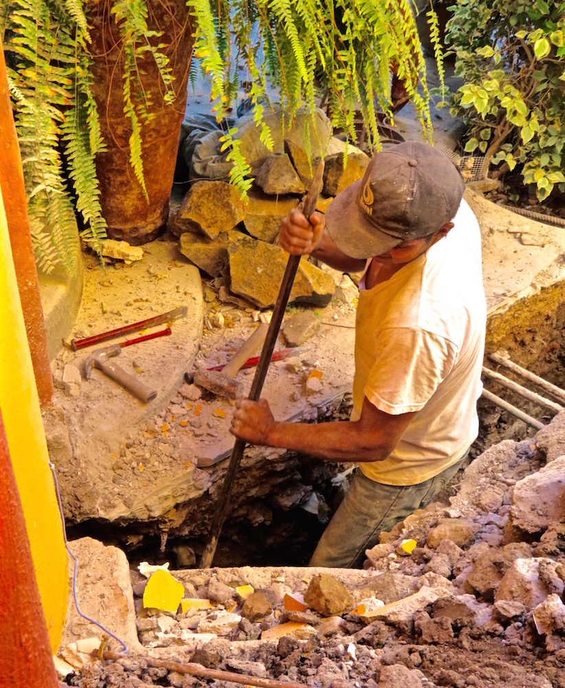 Here is Merced, using hand tools and plenty of muscle to cut through the stone and concrete of the patio to open up room for the foundation.