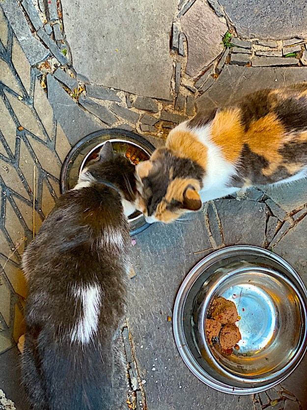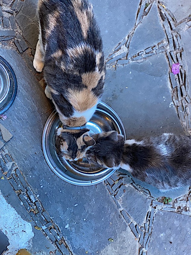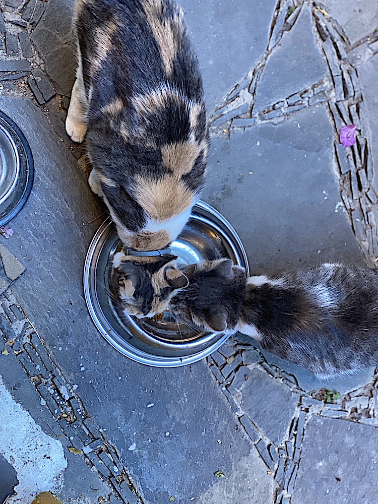 Seeking nutritional renewal, they fall upon their kitty gruel