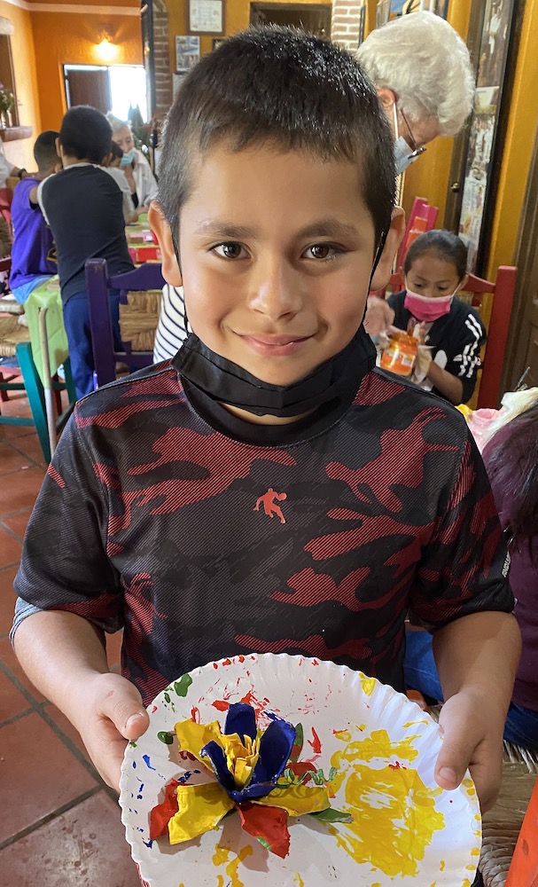 I was so busy during art camp that this was the only photo I was able to take!! This is one young man’s egg carton flower.  Very colorful! The plate is not part of the flower, by the way. Just something to carry it home on.