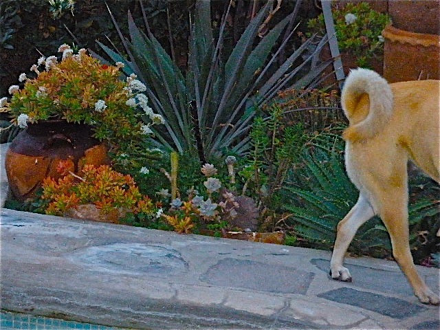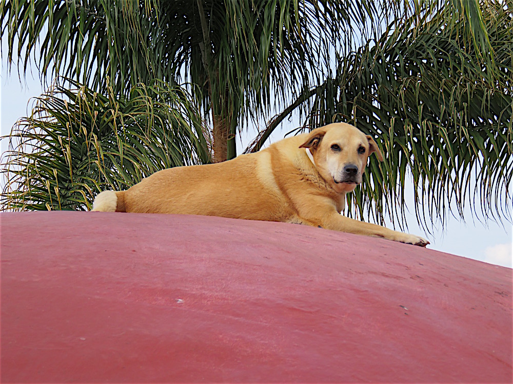 It all started with Frida, who I first met as she trotted down the carretera traveling west as I walked with my friend Joe, going east. She was so tiny that I thought she was a big rat at first, but as she drew nearer, I realized it was a tiny puppy who, when she got up to me, immediately stopped and looked up at me with those eyes that indicated that we already belonged to each other. When she got older, for the next 15 years or so, she spent most of her days up on the dome of my house supervising the neighborhood, and when she passed away, it didn’t take long for me to figure out how she should be memorialized. It took me some months to find a terracotta sculpture that looked like her and to find men to concrete it securely in place. Inside are Frida’s ashes. There she has resided for years, surveying all who pass as she did during her life.