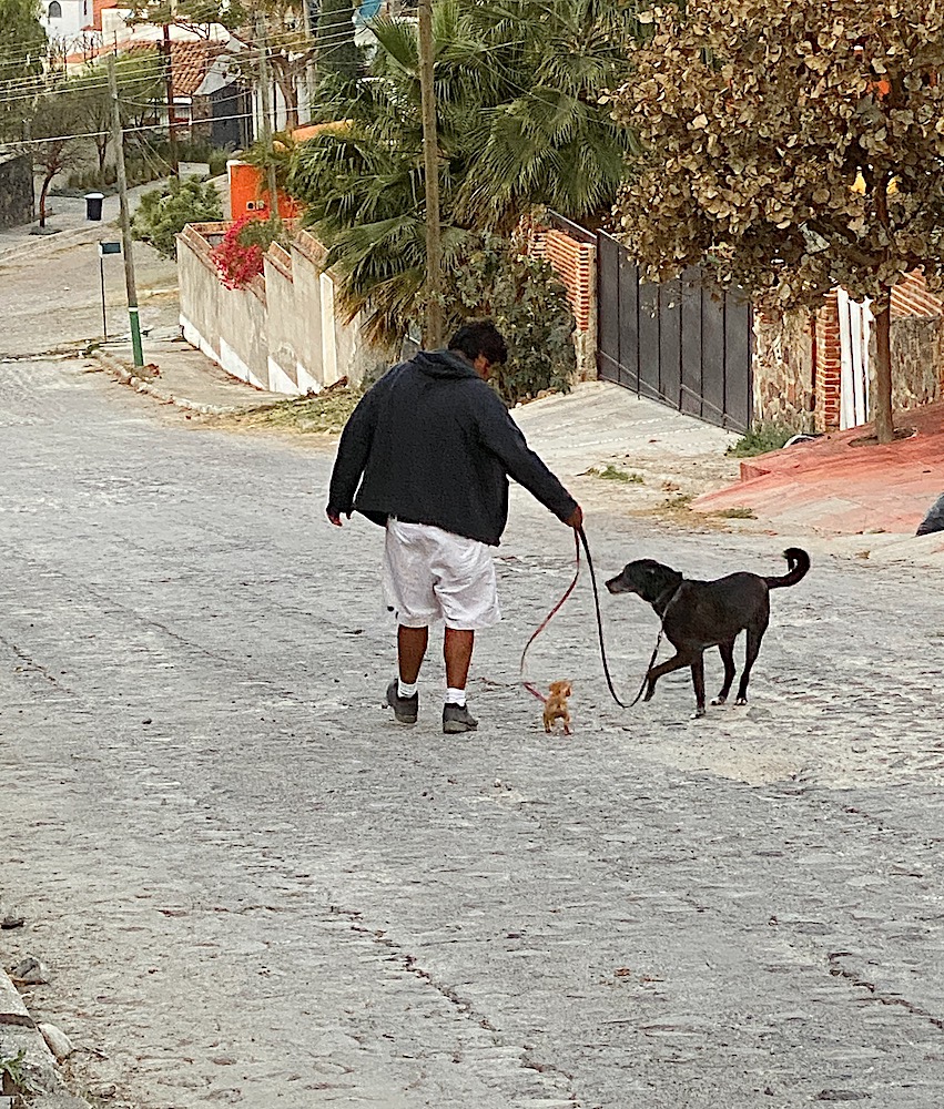 As new dogs arrived in my life, they took to occasionally visiting her on the roof, and then a strange thing happened. In the house kitty-corner across from me, two smaller terracotta dogs appeared, on the post beside the entry gate, Frida directly in their line of vision a story above them on my dome.