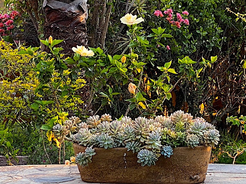on the ledge built into the freshly-painted garden wall.