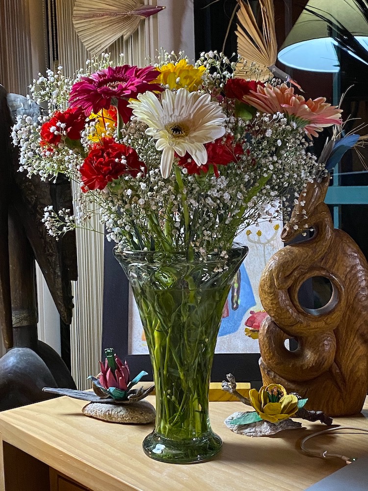 Gerber Daisies are my favorites. Here they are accompanied by carnations and baby’s breath.