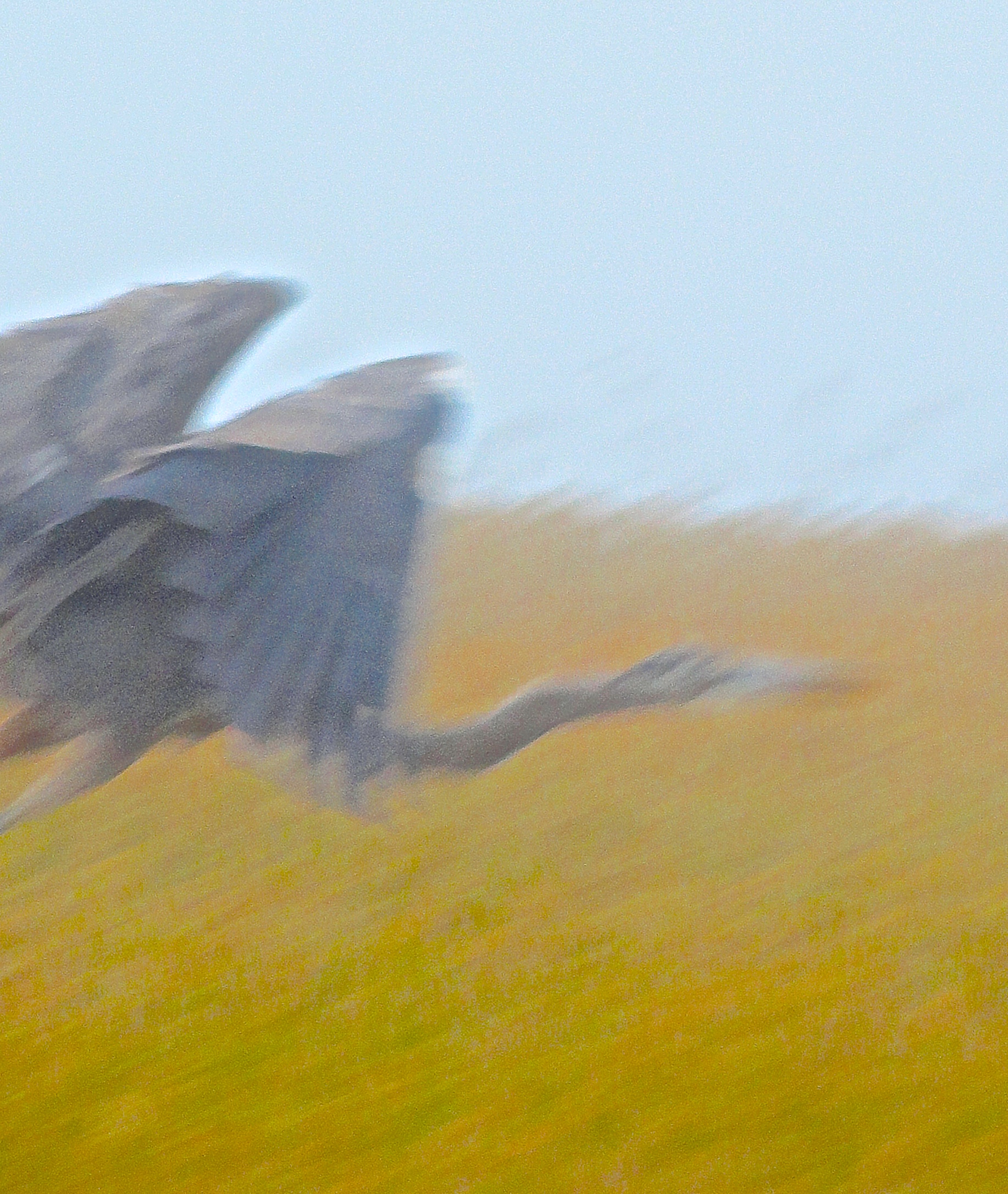 Incredible, the Great Blue Heron stayed, standing silent, moving slowly as we stood silent, walking one way and another until we approached too close. Unprepared, I caught only a ghost shot, like a watercolor, as it flew away: