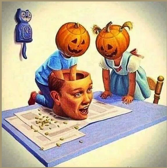 Oh, wait! Now I can see that those were Halloween cookies in the shape of pumpkins that I was going after. My sister Patti, 4 years older than me, had a costume party in the basement the night before and I think I was dipping into leftover refreshments. Her costume, a harem girl, was even more inappropriate than mine. Scarf crisscrossed over her budding chest, a lace curtain wound around her hips, bare midriff, veil and dangle over her forehead. If I were home, I’d show you a photo.