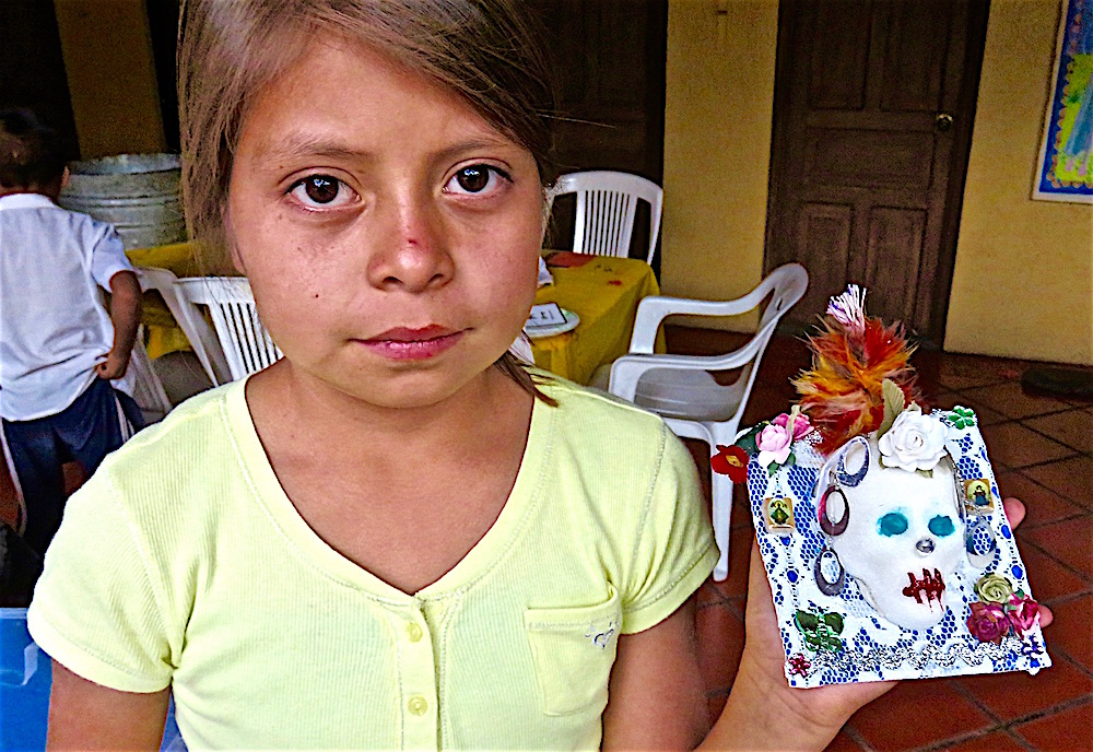 LOUD constant cherrybomb-level explosions that went on for hours, a few dozen feet from where I was docenting the art show, flags on the oldest church in town, LOUD banda music, shopping in the plaza stands, construction of the towering castillo for the night’s firework display, flowers, toys, signs directing dogs to be polite and not pee in the flowers and plants, doggies in full regalia, senoritas in full regalia, wild socks and shoes that were not part of a costume, a gourmet feast at Viva Mexico, Children’s chorus, Agustin’s solo with the children’s choir, a dead bread vendor (a vendor selling dead bread, not a deceased vendor) breaks out into opera and steals the show, tequila samples, women selling adorable knitted hats in the form of ninja turtles, lambs and frogs, tap dancing skeletons, children streaming by in the streets to trick and treat or lining up for face painting. All this and Day of the Dead hasn’t even started!!!