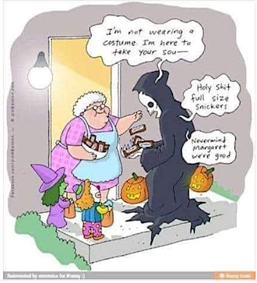 and when the kids climb on his lap, they mutter, “Trick or Treat!”