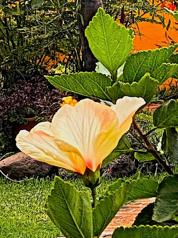 This new hibiscus popped up and surprised me today. I almost forgot to take its picture, and by the time I did, it was twilight. I took several, hoping one would come out okay, but there were several I liked so sharing them all, even though the color isn’t quite right.