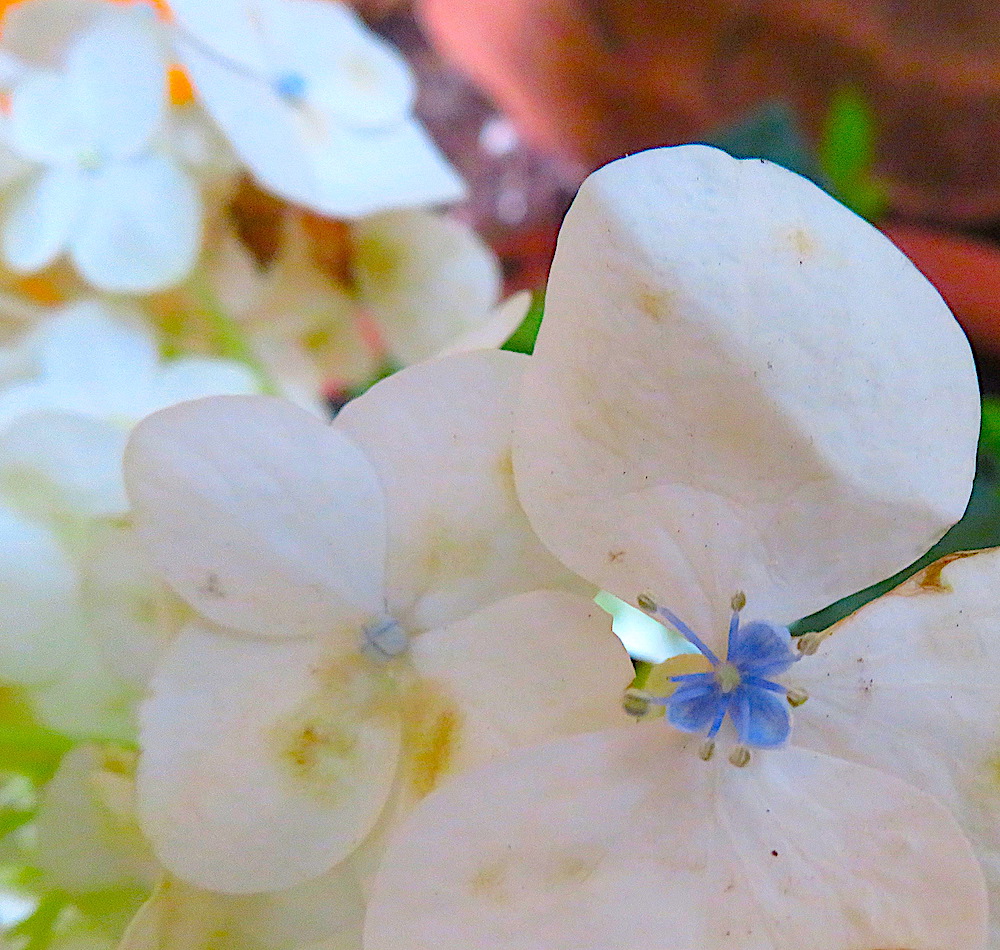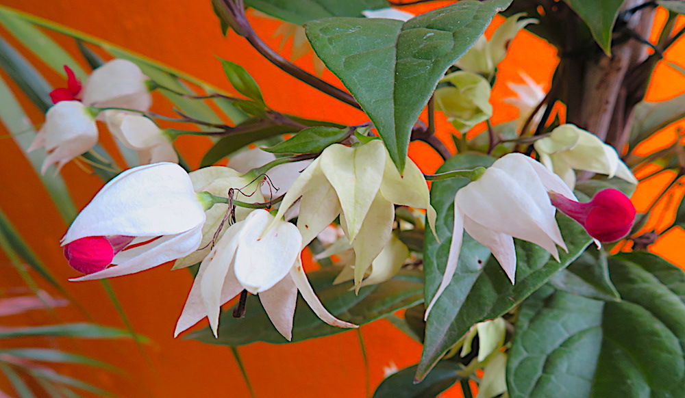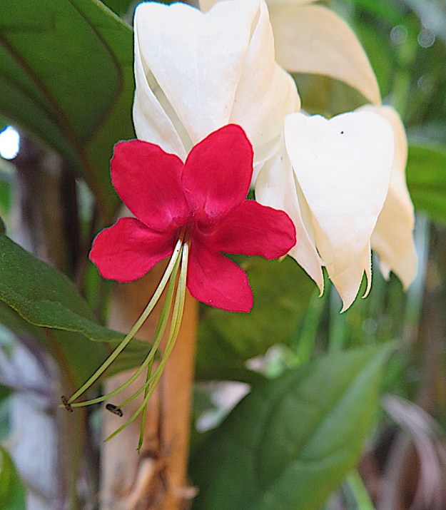 When Pasiano went to the vivero for more soil for my new pots, I asked him to choose two plants for the pots we’d put at the entrance to my house and to just surprise me. These are the plants he bought. Yolanda says the red and white one is an “aretes” plant, which means earrings–I guess because the red hangs down from the white.Through research, I’ve determined that the arete plant (actually, earrings of the queen) is a variety of fuchsia and the other plant is a hydrangea. Mystery solved. They are the only white flowers in my garden. A surprise that the Americano chooses all the bright colors and the Mexicano chose white, albeit with a little splash of blue or red in the center.