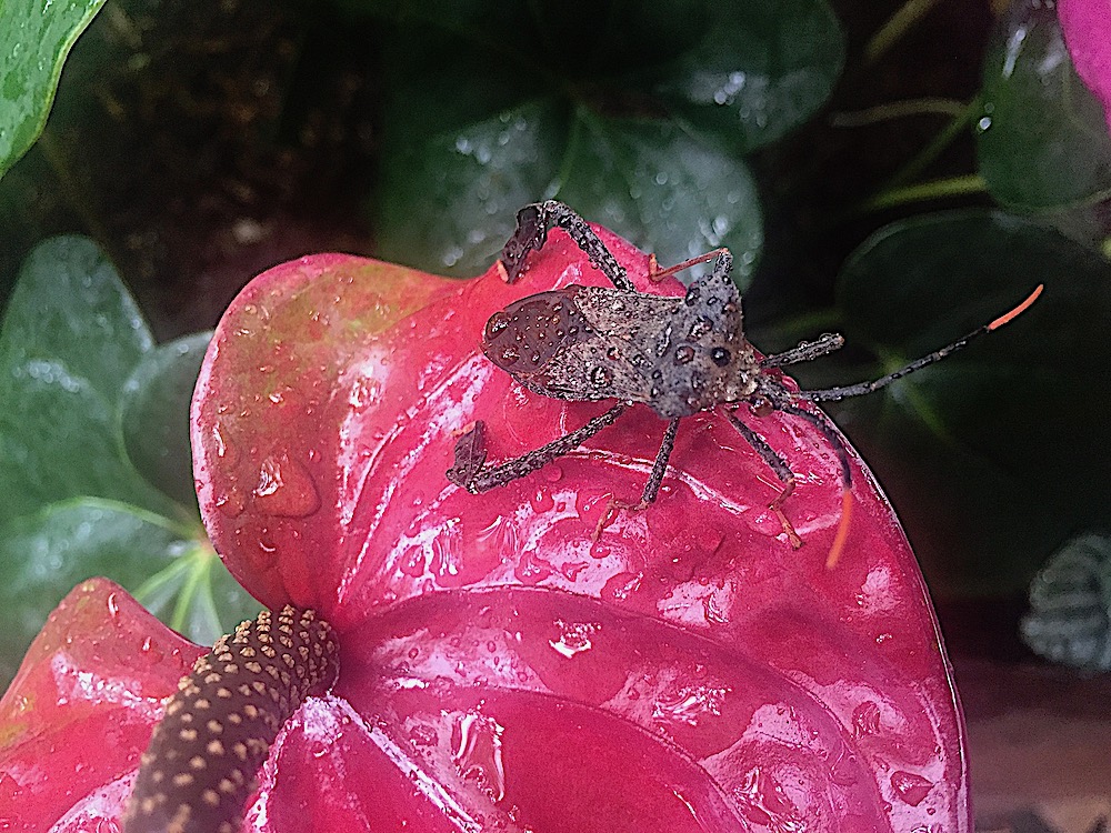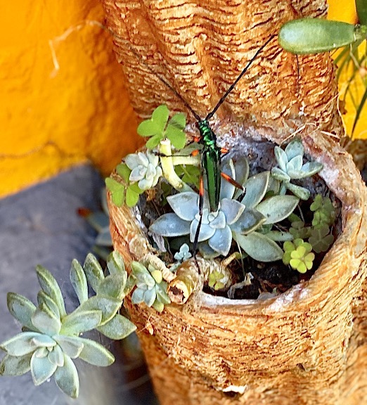 This fellow greeted me when I arrived home today. Actually climbed onto my foot and partway up my leg before I shook him off gently. Then he abandoned me for a trip up the succulent and therefore into this FOTD blog!!! Does anyone know what this exotic fellow is? Absolutely gorgeous but I’ve never seen one before. I’ll do another blog with just him (or her) if the other photos turned out. Haven’t looked at them yet. His body was probably about 2 inches long, not counting his antennae or legs.