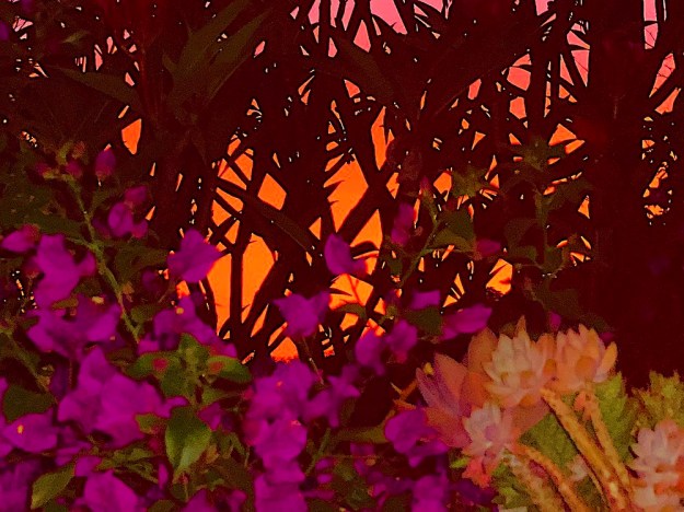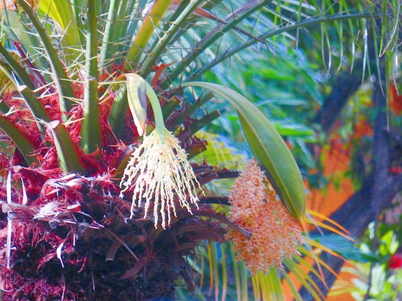 I’ve been trying to find a place for this hardwood carving of my husband’s for 19 years! It just didn’t go in the doggie domain. It needed its own space. A couple of months ago, I went over the dark wood with a white wash, then painted and wiped or sanded off the claws, eyes and letters. I wanted it to look weathered and friendlier than the rich dark wood had looked. Then it sat in my studio. A month later, I drilled and screwed in screws and wire on the back to hang it from. But where to hang it? The pistachio tree next to my hammock already had a Soleri bell and a little painting of a prehispanic figure in the knothole. (Thanks, Jesus Lopez Vega.) Then as I was walking up to the house, I pulled at the trunk of one of the really tall palms and the wood just gave way in my hands. I peeled off a few of the leaf shafts still clinging to the tree and voila! A space just right for the carving. Today I found a big nail and hung it, sorta tucking it in to the frond shafts. Perfect. With the color, it sorta blends into the tree, but as you get closer, you can read the message, “And Owl Moved to Some Other Tree.” R.I.P. Bob. I hope you are watching.